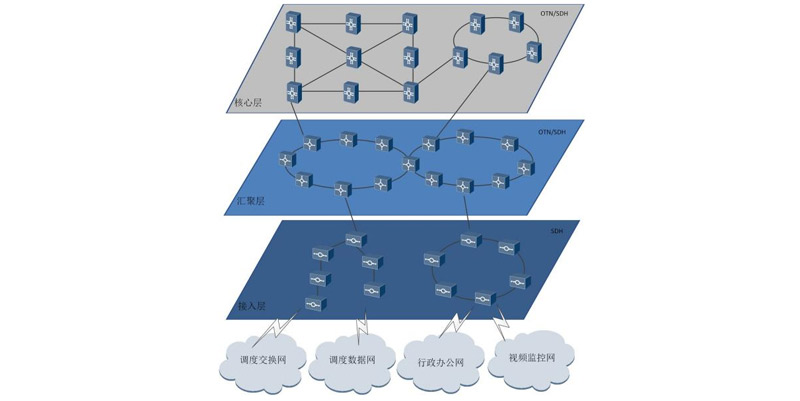 公司的通信系統(tǒng)集成方案采用核心層、匯聚層和接入層三級(jí)網(wǎng)絡(luò)構(gòu)架,三級(jí)網(wǎng)絡(luò)主要由OTN、SDH、XPON、CPE等設(shè)備部署構(gòu)成,具有承載業(yè)務(wù)多樣、網(wǎng)絡(luò)結(jié)構(gòu)簡(jiǎn)單、網(wǎng)元管理便捷、系統(tǒng)性能穩(wěn)定等特點(diǎn)。